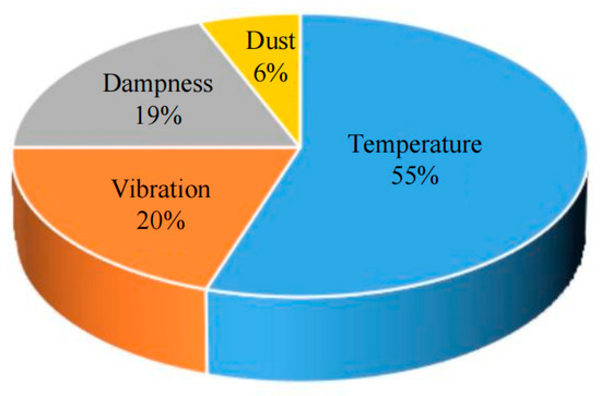 In general, there are two primary reasons for electronic device failure: low-cycle thermal fatigue from temperature loading and high-cycle mechanical fatigue resulting from shock drops, vibration, and other loads [10]. Based on statistical data published by the US military, 55% and 20% of electronic device failures were attributed to temperature loading and shock and vibration, correspondingly, as depicted in Figure 2 [11]. Most electronic device failures are caused by the malfunction of crystal structures in materials, such as solder balls and columns. Therefore, it is necessary to investigate the mechanical properties and failure mechanisms of these crystal structures when they are subjected to thermal loading. This research will facilitate the study of their performance and reliability.