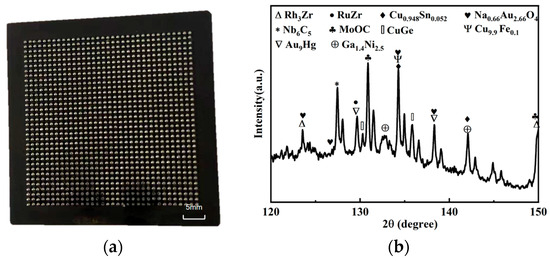 The back side of the test sample, which is at the BGA solder joints, was analyzed using XRD phase search software and shown in Figure 9. After a comparison with the PDF standard diffraction pattern, the main composition of the measured sample may be Rh3Zr (PDF NO:00-017-0049) and Nb6C5 (PDF NO:00-037-1201), but also some Au9Hg, RuZr, Cu9.9 Fe0.1, Cu0.948 Sn0.052, CuGe, Na0.66Au2.66O4, etc. Some of the main phase XRD patterns at 120–150° are shown in Figure 10.