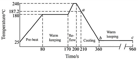 In this paper, we present an experimental and transient temperature field thermal analysis simulation of a loaded reflow temperature profile for lead-free solder. As shown in Figure 14, the temperature profile comprises four regions: preheating, holding, reflow, and cooling zones. We provide a detailed analysis and causal connections between the different zones. SAC305 solder has a melting point temperature of 217 °C with a difference of 29.8 °C between its solidification and melting points. This means that the cooling solidification temperature of the joints is 187.2 °C, which corresponds to point a in Figure 14.