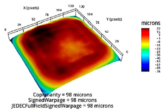 It is evident that the initial state samples exhibit some degree of warpage, resulting from the product’s manufacturing process and other influencing factors. However, the finite element simulation represents an ideal state that cannot replicate the warping deformation of the sample’s initial state. From the simulation results of warpage deformation of the CBGA encapsulation cover, it is evident that the warpage value gradually increases with rising temperatures and decreases and returns to its initial state as temperatures decrease. The maximum warpage value and its trend are consistent with the measured value.