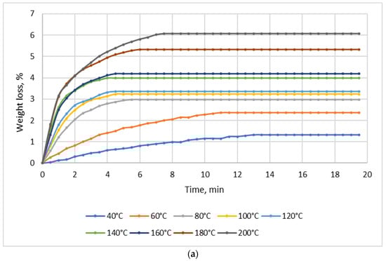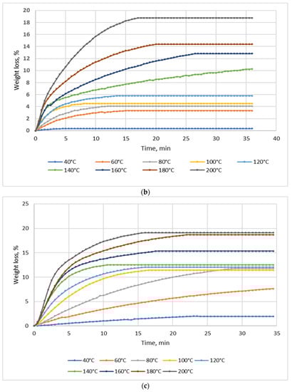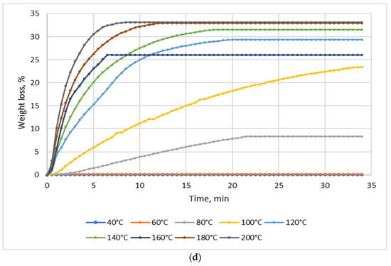 Drying tests were performed for each material (NSP1-NSP7) using batches of 10 g; the drying temperature range was 40–200 °C. Figure 2 shows four selected diagrams of NSP materials (NSP1, NSP3, NSP5, NSP7).