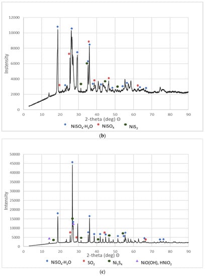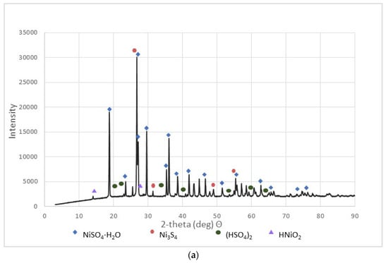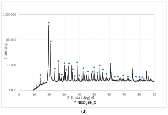 After the analysis of the obtained results, it was concluded that these materials are semi-finished products of various composition, which have a good potential for Ni recovery, but are not directly suitable for the production of Ni(ReO4)2. The Ni content ranged from 16 to 30%, while the Co content ranged from 0.019 to 1.32% and Cu from <0.005 to 12%. In the cases of Mg and Pb, the content of these metals did not exceed 0.08% each. On the other hand, the Na content was <0.2%. The amount of Fe, Ca and Zn was very diverse and amounted to <0.0005–0.51%, 0.07–1.58% and 0.0033–0.23%, respectively. The acid content in all the tested samples varied and ranged from 0.3 to 8.2%. The smallest amount of impurities was found in NSP7, and the highest in NSP3, which contained 12% of Cu. A relatively high cobalt content (1.32%) was determined for NSP6. NSP1, NSP3, NSP4 and NSP6 had a high acid content, and NSP2 and NSP7 materials had a low acid content.
