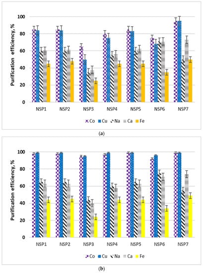 Nickel was analyzed in all solutions; at this stage, for the selected solvents, nickel losses amounted to 2–6%. The lowest nickel loss was identified while using glycerol. The highest purification efficiency from copper and cobalt (>95% and >90%, respectively) was obtained when methanol was used for the purification. The purification efficiencies from copper and cobalt while using ethanol were slightly lower than the those obtained with methanol; however, the sodium and calcium purification efficiencies were on average 5% higher. The iron purification efficiency using ethanol or methanol was around 41%. In the case of copper and cobalt, methanol and ethanol turned out to be effective purifying agents; in the case of sodium and calcium it was glycerol; and in the case of iron it was ethylene glycol. Due to the variety of materials, it was considered that, in general, the purification of NSP materials should be carried out with the use of a mixture of alcohols, where a minimum of 5 cm3 of solution should be used for each 1 g of the material, in the following proportions: