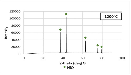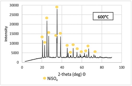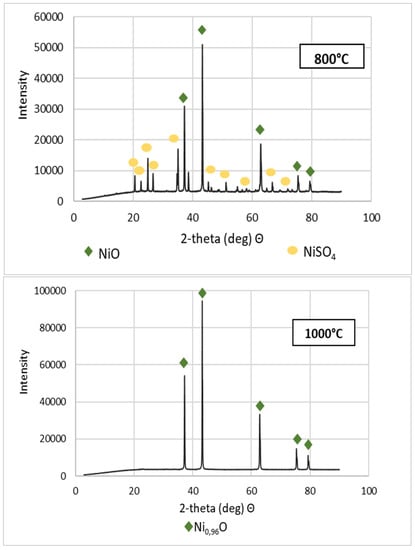 Stoichiometrically calculating from 5 g of nickel(II) sulfate hexahydrate, 1.43 g of nickel(II) oxide should be obtained. Analyzing the results, the same amount was obtained after roasting at 1200 °C. The obtained material was green in color (Figure 6). By roasting at 600 °C, anhydrous nickel(II) sulfate was produced, with a yellow-green color (Figure 6). In the case of the powder obtained at 800 °C, there were spots of green particles, but most of them were black—both colors are attributed to nickel(II) oxide. The material obtained as the result of roasting at 1000 °C indicates obtaining the target oxide, both in color (dark green) and mass (1.45 g). Quantitative analysis (Table 3) and qualitative X-ray phase analysis were performed for each powder. Both analytical techniques confirmed obtaining pure nickel(II) oxide, both during roasting at 1000 and 1200 °C. Summarizing the results of the roasting tests, it can be stated that NiO of stoichiometric composition and high purity can be obtained using the roasting temperature of 1200 °C, for 1 h, with the gas flow of 5 dm3/min. Using this procedure, successive batches of nickel(II) oxide were produced for the studies on the preparation of nickel(II) perrhenate.