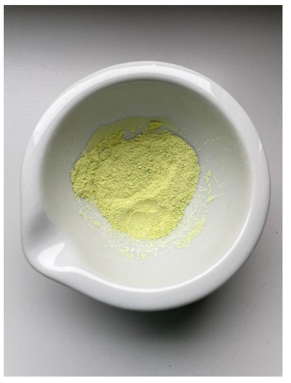 The resulting solution was evaporated to dryness, also at a temperature not exceeding 80 °C. The precipitate of hydrated, crude nickel(II) perrhenate obtained in this way was divided into 1 g portions and successively washed on a filter with various organic solvents (methanol, ethanol, acetone) in the amount of 10 cm3, thus obtaining finished products. The powders were successively dried at 160 °C and analyzed for the content of the main components, i.e., Ni and Re, and selected impurities: Bi, As, Zn, Cu, Co, Mg, Fe, K, Pb, Na, Ca and Mo. Figure 7 shows a photo of the final product.