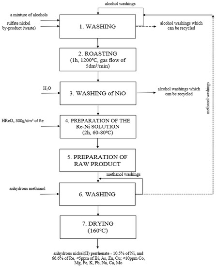 Using the aforementioned conditions, the new, hybrid technology for obtaining anhydrous nickel(II) perrhenate of high purity, entirely from waste, was created. The source of nickel was Ni-containing sulfate semi-finished products (NSP); a material with a very diverse composition, obtained during Cu production in Poland. In the course of the presented research, the method of its transformation into the form suitable for the production of nickel(II) perrhenate, i.e., nickel(II) oxide, was developed. Obtaining the appropriate form and purity of nickel(II) oxide was possible through three successive technological operations, i.e., washing of the NSP with the mixture of alcohols (ethanol, methanol and/or glycerol and/or ethylene glycol) (1), roasting of the NSP at the temperature of 1200 °C (2), and washing of the obtained product with water (3). The nickel(II) oxide obtained in this way was the suitable material for the reaction with perrhenic acid. In this way, the Ni-Re solution (4) was formed, which was subsequently evaporated to dryness (5). The obtained precipitate was washed with methanol (6) and then dried (7). The method was developed in accordance with the principles of sustainable development (the 5R’s—Refuse, Reduce, Reuse, Repurpose, Recycle), as it manages all waste and thus minimizes the losses of valuable metals, such as rhenium and nickel, to zero.