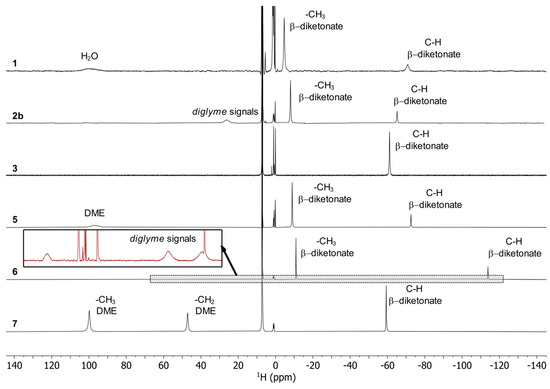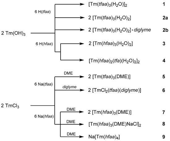 | 1 [Tm(tfaa)3(H2O)]2 | 3 [Tm(hfaa)3(H2O)2] | 5 [Tm(tfaa)3(DME)] | 7 [Tm(hfaa)3(DME)] | |