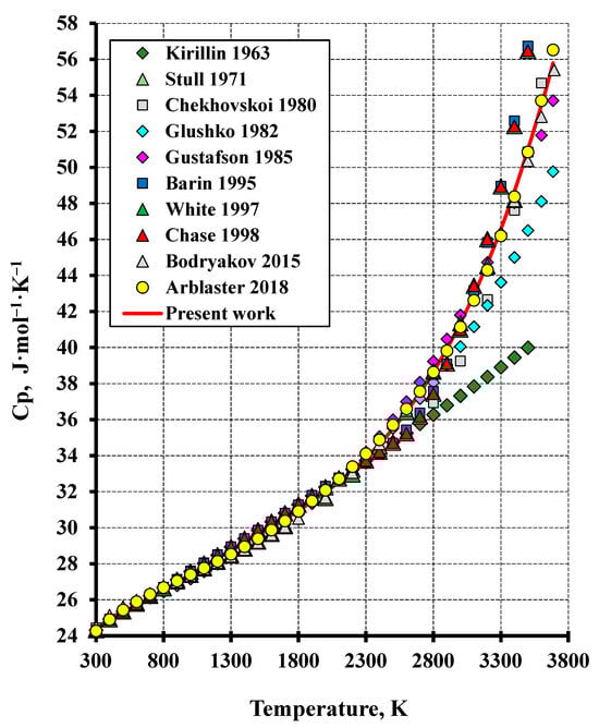 The thermodynamic functions of tungsten are outlined in the reference literature and review papers [4,17,18,19,20,21,22]. Some studies examined only separate properties such as heat capacity and enthalpy [23] or only heat capacity [24,25]. The comparative values of heat capacity from the cited works are outlined in Table 1.