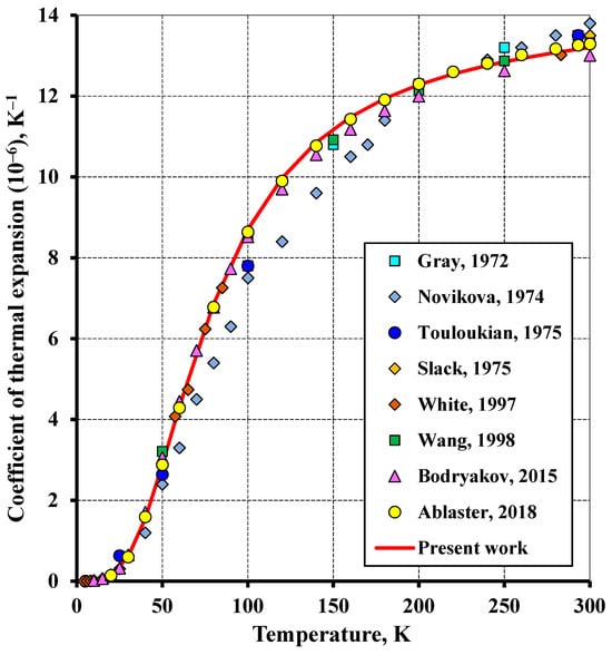 The low-temperature coefficient of thermal expansion (Figure 3) is in agreement with all the data reviewed, except the study [29]. This is associated with the fact that a small number of experimental data were averaged in the study [29] and exhibited a significant spread in addition.