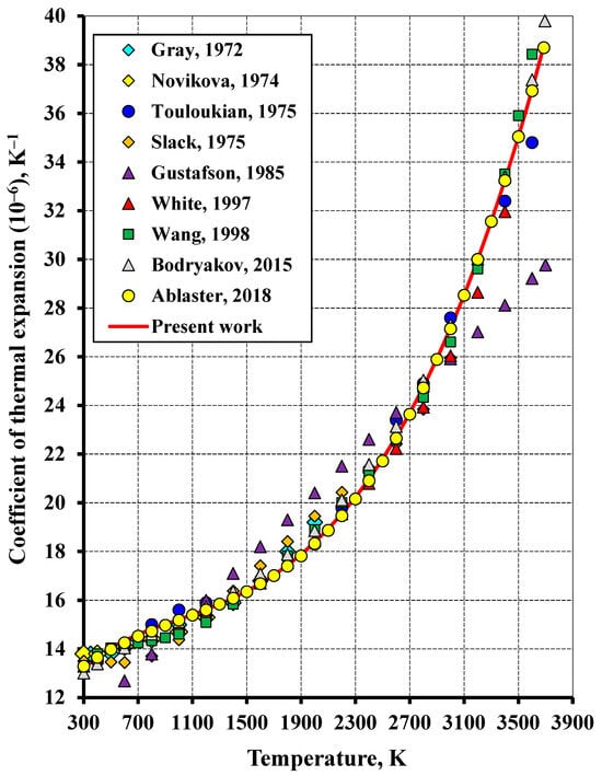 The calculated thermal expansion coefficient in the high-temperature region (Figure 4) exhibits a rather good correlation with all the literature sources reviewed, except the study [4]. This is because the study [4] adopted a linear temperature dependence of the isobaric thermal expansion coefficient, whereas the experimental data indicate a substantially non-linear character of this dependence.