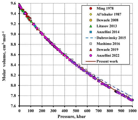 Figure 5 plots the molar volume of tungsten versus pressure at 298.15 K. The total number of experimental points is 177. The average absolute deviation of the calculation from the experiment was 0.005 cm3·mol−1, RMS = 0.08%. The isothermal bulk modulus at 298.15 K was calculated to be 3072.8 kbar, with a pressure derivative of 4.009, in agreement with the literature data set forth in Table 3, considering the different EoS types used.