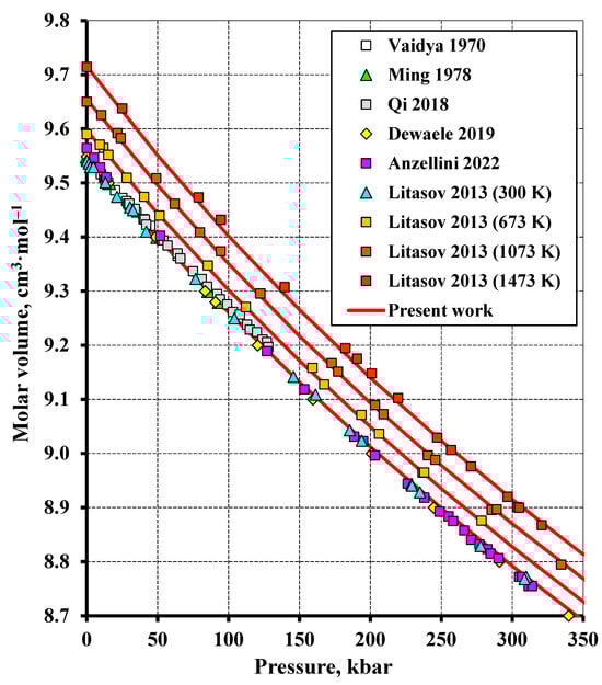The volume compression of tungsten up to 350 kbar at different temperatures compared to the experimental data (Vaidya (1970) [32], Ming (1978) [33], Litasov (2013) [36], Qi (2018) [39], Dewaele (2019) [40], Anzellini (2022) [41]).