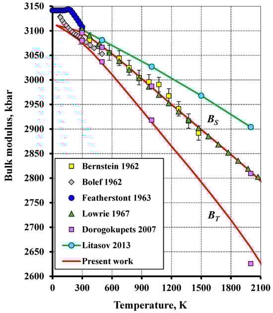 By constructing the equation of state for tungsten, we employed data obtained from the measurement of elastic constants and adiabatic bulk modulus at a temperature of 298.15 K [45,46,47] and at 280–1473 K [48], 77–500 K [49], 0–300 K [50] and 293–2073 [51]. The mean of the adiabatic modulus at room temperature was calculated from all the literature data to be 3110 ± 25 kbar (0.81%).