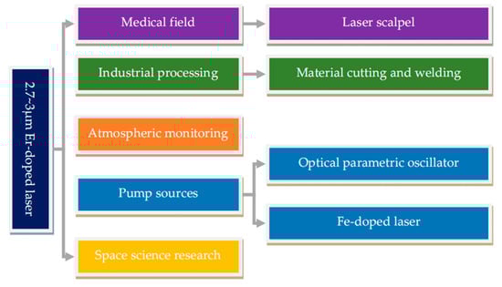 The application of 2.7~3 μm Er-doped lasers is shown in Figure 1. The 3 μm laser within the strong absorption peak of water can be used for laser surgery in the medical field, which is more beneficial to human tissue cutting and blood coagulation than conventional surgery [4,5]. The high-energy single-pulse 3 μm Er laser is used for soft tissue and bone cutting, excision surgery, dental ablation surgery, and cosmetic laser rhytidectomy [4,5,6,7,8,9]. It is used for cutting and welding materials in the field of industrial processing. The laser in this band is located in the atmospheric transmission window [3] with low propagation losses, which is also suitable for direct use in space science research. In the meantime, the tunable Er laser can be used for atmospheric monitoring [7]. In addition, high-energy 3 μm Er lasers with stabilized pulse outputs can be used as pump sources for 3~5 μm and 8~14 μm optical parametric oscillators [8,9,10,11,12]. They are conducive to the generation of mid- and far-infrared laser outputs, which can have irreplaceable applications in some fields (e.g., in the fields of electro-optical countermeasures, LIDAR, atmospheric monitoring [8,9,10,11,12], etc.). The 3 μm Er laser has always been the focus of research in the field of lasers because of its important applications in the military and civilian fields.