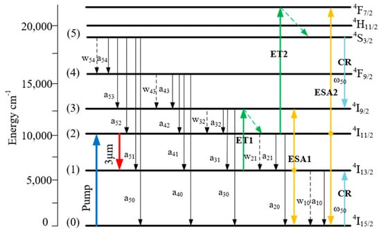 This schematic illustrates the energy level transition for a 3 μm Er−doped laser. aij—the probabilities of radiation (0, 1, 2, 3, 4 and 5 represent the corresponding energy levels, respectively; i, j = 1, 2, 3, 4, 5); wij—the probabilities of multiphonon transitions; ω50—cross relaxation rate [14,41].