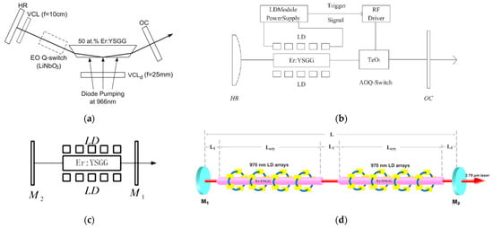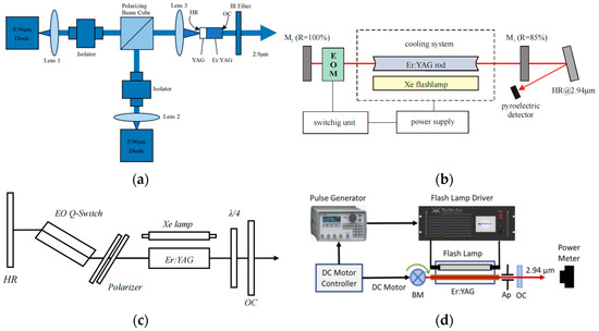 (a) Diode-pumped Er:YAG laser [60].; (b) lamp side-pumped Er:YAG electrooptically Q-switched laser [5]; (c) lamp side-pumped Er:YAG two-polarizer high-power electrooptically Q-switched laser [62]; (d) mechanically Q-switched Er:YAG laser [63].