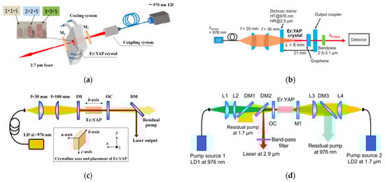 (a) Diode end-pumped dual-wavelength Er:YAP laser [120]; (b) monolayer graphene saturable absorber Er:YAP pulsed laser. Reprinted with permission from Ref. [122]; (c) high-efficiency Er:YAP laser [124]; (d) dual-wavelength-pumped 2.9 μm Er:YAP laser. Reprinted with permission from Ref. [125].