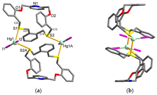 First, a colorless crystalline product 1 was obtained by slowly evaporating a mixed solution of L and HgI2 in dichloromethane/methanol. Crystal 1 crystallizes in the triclinic space group P-1 with the formula [(Hg2I4)L2] and adopts a 2:2 dimeric complex (Figure 1 and Figure S1, see in Supplementary Materials). The asymmetric unit of 1 contains one ligand, one mercury atom, and two iodide ions. The cyclic dimeric structure is formed through an inversion center. The mercury(II) center is four-coordinated, being bound to two bridging sulfur atoms in L and two iodide atoms. The coordination geometry of Hg(II) can be described as a see-saw (saw-horse) geometry (Figure S3 and Table S1). In 1, the bond distances of Hg–S (Hg1-S1 is 2.8014(13) Å and Hg1-S2A is 3.0054(13) Å) are longer than the normal range of Hg–S (2.5–2.8 Å), which is less than the sum of the van der Waals radii of 3.53 Å (Hg = 1.73, S = 1.80 Å) [35]. Meanwhile, the bond distances of Hg–I (av. 2.634 Å) are within the normal range.