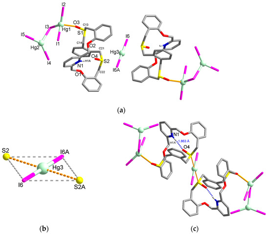 Crystal structure of 2, [Hg2(HLox)I5]2[HgI2]: (a) view of the three-separated parts, (b) the pseudo-square planar geometry of the Hg(II) center in the metal cluster unit [∠I6−Hg3−I6A 180.0°] and (c) the intermolecular interaction between the pyridine ring and sulfoxide t[N1-H1A···O4 (blue dashed lines): 1.863 Å; N1···O4 2.699 Å].