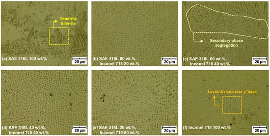 Additionally, equiaxed austenite grain structures are preserved when the Inconel 718 component ratio is between 40 and 60 wt.%. However, the boundaries of austenitic grains begin to disintegrate when the Inconel 718 component ratio reaches 80 wt.%. At a 100 wt.% Inconel 718 component ratio, only irregularly shaped Laves phase precipitates are observed, as illustrated in Figure 5e,f. This phenomenon is likely attributable to the increasing levels of nickel and niobium equivalents as the Inconel 718 component ratio rises. As indicated by the EDS analysis results presented previously in Figure 4, the increase in nickel and niobium equivalents leads to the precipitation of the γ″ (NiNb) secondary phase within the pre-existing austenitic grains, thereby disrupting the austenitic grain boundaries [].
