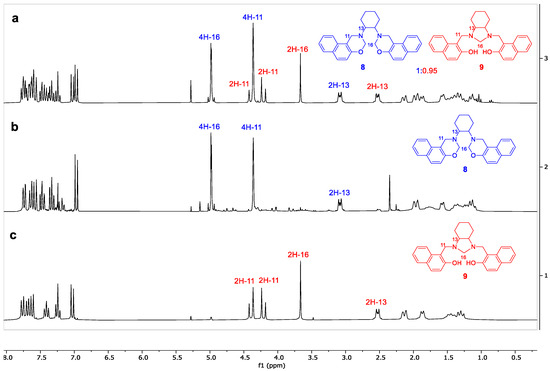 The condensation of cyclohexane-1,2-diamine (6), naphthalene-2-ol (7) and formaldehyde (Scheme 1b) was of particular interest, since the formation of a salen-type structure was expected. Salen ligands are described as efficient catalysts in certain enantioselective processes [8]. The initial condensation experiments were performed with racemic cyclohexane-1,2-diamine (6) in ethanol as a solvent at room temperature (Scheme 1b). An aqueous solution of formaldehyde (37%) was used in large excess and the reaction outcome was monitored by TLC. The formation of the expected bis-dihydro[1,3]naphthoxazine 8 was recognized in the crude reaction mixture by NMR spectroscopy (Figure 1, Table 1). The amine 6 was consumed over the course of a 3 h reaction time (Table 2, entry 1). Besides this, an additional compound with similar structure was identified and determined as imidazolidine 9 (Scheme 1b). The experiments for separation and isolation (column chromatography, crystallization) of products 8 and 9 in pure form were unsuccessful. However, it was possible to distinguish the two compounds in a mixture and to determine undoubtedly the structures by using NMR and HRMS experiments. In Figure 1, representative 1H NMR spectra of 8 and 9 are shown and in Table 1 the characteristic chemical shifts of the individual compounds are introduced.