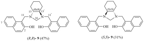 2.3.1. Synthesis of 1,1′-(((3aR,7aR)-Hexahydro-1H-benzo[d]imidazole-1,3(2H)-diyl)-bis(methylene))bis(naphthalen-2-ol) ((R,R)-9)