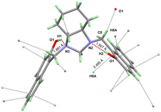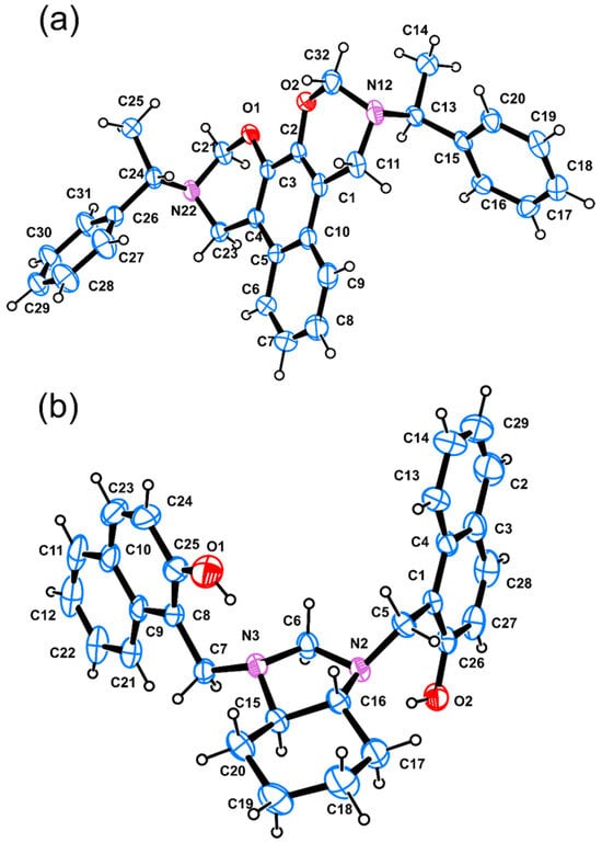 The molecule of compound (R,R)-9 (Figure 3b) consists of a central octahydro-1H-benzo[d]imidazole fragment that is connected with two 1-methylnaphthalen-2-ol side chains via N–C covalent bonds (N3–C7 and N2–C5). Furthermore, the octahydro-1H-benzo[d]imidazole moiety (rmsd = 0.207 Å) is built up by fused six-membered cyclohexane and five-membered imidazolidine aliphatic rings sharing the C15 and C16 carbon atoms. The cyclohexane and the imidazolidine rings are non-planar (rmsd = 0.239 Å and 0.200 Å) and have “chair” and “half-chair” conformation, respectively. The 1-methylnaphthalen-2-ol side chains are planar with an rmsd of 0.040 Å (for the N3-bonded one) and 0.015 Å (for N2-bonded one). The angles between the normal of the mean planes of the N3-bonded and N2-bonded 1-methylnaphthalen-2-ol fragments and the central octahydro-1H-benzo[d]imidazole fragment are 81.99° and 100.24° and the twist/fold angles are 82.19°/168.6° and 98.85°/29.75°, respectively.