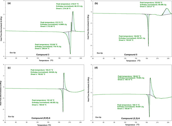 The thermal stability of compounds 3, 5, (R,R)-9 and (S,S)-9 was evaluated using differential scanning calorimetry in the temperature region of 30–250 °C. The DSC thermograms of compound 3, (R,R)-9 and (S,S)-9 (Figure 5a,c,d) disclose a similar thermal comportment, e.g., a sharp endothermic effect followed by sharp exothermic effect. For all 3, (R,R)-9 and (S,S)-9 compounds, the endothermic effect is related to the melting of the compounds while the immediately following exothermic effect is associated with the decomposition of the compounds. According to the DSC data, the melting behavior for (R,R)-9 and (S,S)-9 is similar, with maximums at 191 and 188 °C, respectively (Figure 5c,d). The thermal comportment of 5 features also an endothermic and an exothermic effect (Figure 5b). For compound 5, the melting is observed at ~185 °C while the decomposition is delayed with ~40 °C after the melting has finished.