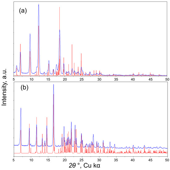 Comparison between the collected powder X-ray diffraction data (in blue color) and that calculated from single crystal (in red color) for (a) compound 3 and (b) compound (R,R)-9.