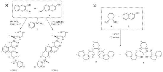 Condensation of (a) naphthalene-diols 1 or 4 and (S)-(−)-1-phenylethane-1-amine (2) and (b) cyclohexane-1,2-diamine (6) and naphthalene-2-ol (7) with formaldehyde.