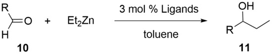 The imidazolidine derivatives (R,R)-9 and (S,S)-9 possess suitable structure and properties to be used as ligands in the model reaction for the enantioselective addition of diethylzinc to aldehydes by using a standard procedure (Scheme 2). The imidazolidine derivatives of 9 were applied in 3 mol % quantity by using of standard conditions described in the literature (see Section 2) [7,16,17,18]. A series of aromatic aldehydes were tested in the addition reaction, leading to the chiral secondary alcohols of type 11. The yields obtained (Table 3) ranged from moderate to very good; however, in several cases (entries 4–6 and 10), this was after prolonged reaction times. The enantioselectivities achieved were moderate. The prolonged reaction times indicates the relatively low efficiency of the chiral catalyst formed in situ in respect to the enantioselectivity, although the chemical yields were acceptable and, in some cases, even very high.