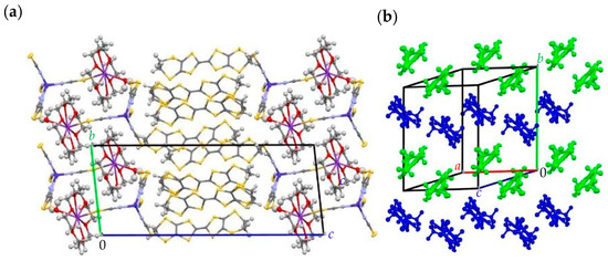 Conductive organic and insulating inorganic layers alternate in the sequence [I-II-III-III-II-I-]∞ along axis c (Figure 2a), where I is a conducting radical cation BEDT-TTF organic layer, II is an anion layer, composed of double-charged anions Co(NCS)42−, and III is a K+(18-crown-6)∙(H2O) non-conductive cation layer that decreases the charge of the former double-charged anion by one. Thus, the anion layer is organized similar to a pancake, where two positively charged K+(18-crown-6)∙(H2O) layers III are situated inside this anionic [-II-III-III-II-] assembly. Anions Co(NCS)42−, forming layers II, are rendered to its periphery, residing in a close proximity to the BEDT-TTF radical cations A. That serves as an additional factor elevating the local Coulomb potential favoring charge localization in the conductive layers.