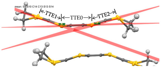 B molecular bending. Mean planes drawn through planar TTE parts: C11, C12, S9–S12 (TTE0, central); C13, C14, S9, S10, S13, S14 (TTE1, left); C15, C16, S11, S12, S15, S16 (TTE2, right). The legend in the upper left corner lists the atoms selected to draw the mean plane of TTE1 subunit depicted by the red semi-transparent plane drawn through the listed atoms. See Figure 4 for atom numeration.