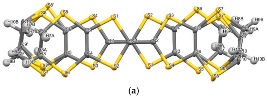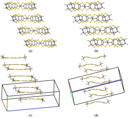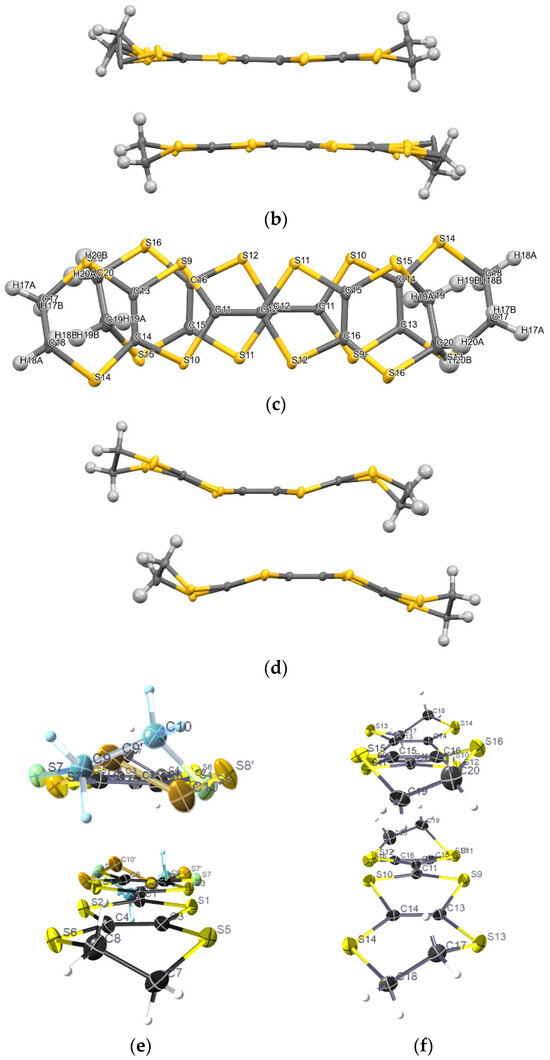 One terminal ethylene group of A is disordered with the occupancies of 0.85/0.15 (Figure 4e). A peculiarity of this disorder is that not only are the terminal ethylene groups disordered, but so are the sulfur atoms that bear the ethylene group. Disordering parts other than terminal ethylene group is rare but not unique case for ET salts and related compounds. For example, in the salt β-(DOET)4CuBr4·PhCl, the entire annealed dioxane ring is disordered (DOET is acronym of (1,4-dioxanediyl-2,3-dithio)ethylene-dithiotetrathiafulvalene, formed by replacing one of the ET terminal ethylene group with 1,4-dioxane ring) [86].