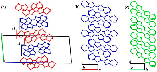 However, in some particular cases, it is necessary to consider the longitudinal displacements of ET radical cations, which are imperceptible in the aforementioned projection. Furthermore, we explore the common κ-type package in terms of “indentation” modifiers. The indents resulting from the intralayer ET radical cation longitudinal displacements naturally manifest themselves in the projections perpendicular to the one presented in Figure 2b (Figure 6).