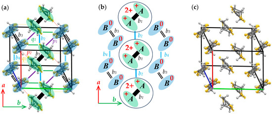 This arrangement is reminiscent of the horizontal charge order stripes found in the charge-ordered θ-ET salts (e.g., θ-ET2RbCo(SCN)4) [46]; however, in this particular case, vertical charge-order stripes are formed. The difference between horizontal and vertical stripe orders is in the symmetry of transfer integrals driven by the interplane angle between adjacent ET-s in the chain. The mean planes of incorporated ET-s are inclined (for simplicity—orthogonal) in the former and parallel in the latter [35,47]. Assuming an enhanced level of charge separation in salt 1, comparing with θ-salts, the chains of BEDT-TTF AA dimers with the charge +2 running along axis a are named superstripes in the current work. The resulted spatial pattern of charge ordering is a stripe alternating along axis b.