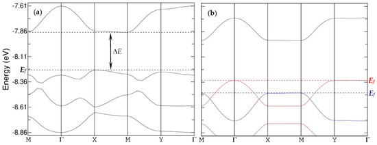 Band structure demonstrates medium-to-low dispersion along axis b (Figure 8a). This is in the contrast with the very high dispersion along axis a. Band structure of chains AA and BB taken independently provides qualitatively similar picture (Figure 8b). One should keep in mind that the lowest empty band for neutral BB-chains is formed from BEDT-TTF LUMO levels, and subsequently, lies far above the picture energy scale. Conversely, the lowest empty band for charged AA-chains is formed from BEDT-TTF HOMO levels, and thus, it is accessible for activation transport. The main effect of the hybridization of upper occupied bands of AA- and BB-chains is raising of the Fermi level, which in turn reduces activation energy ΔE. This indicates relatively low coupling of AA- and BB- chains in the square lattice and axis a as a preferrable direction for current flow, imposing presumably q1D conduction architecture.