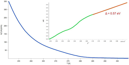 Temperature dependence of the normalized electrical resistance for salt 1 along axis a. (inset) Arrhenius plot in natural logarithm coordinates of normalized electrical resistance (lnR) vs. reciprocal temperature (T−1). Linear part for the fitting is depicted by red color.