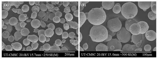 An Fe-based SMA with the composition of Fe-34Mn-15Al-7.5Ni (at. %) was used in this work. The powder was prepared using a gas atomization process under an argon environment. The chemical composition was evaluated using energy dispersive X-ray (EDX) analysis shown in Table 1. The EDX analysis confirmed the powder as a good match with the nominal composition of the Fe-Mn-Al-Ni SMA. The majority of the powder’s particles have been identified to be spherical using scanning electron microscopy (SEM), as shown in Figure 1, with a d50 of 33.8 m and a size distribution ranging from 15 to 53 μm. The powder had a uniform distribution, and the spherical shape of the particles improved flowability.