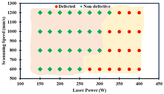 Laser power vs. scanning speed manufacturability map.