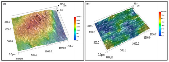 3D topographic images of Fe-34Mn-15Al-7.5Ni SMA samples: (a) sample with the highest Sa fabricated at a power of 250 W and a scanning speed of 1000 mm/s and (b) sample with the lowest Sa fabricated at a power of 200 W and a scanning speed of 1000 mm/s.