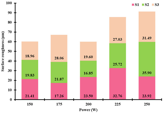 Average surface roughness (Sa) analysis of the LPBF Fe-34Mn-15Al-7.5Ni SMA fabricated at 150–250 W with corresponding scanning speeds of 800 mm/s (S1), 1000 mm/s (S2), and 1200 mm/s (S3).