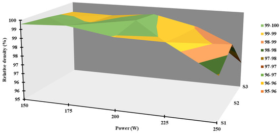 where ρVariable is the measured density of the fabricated parts, and ρFixed is the theoretical density of the alloy. The relative density was evaluated and represented in Figure 6. The results showed fluctuations over the used processing parameters. Lower densities were observed at the highest and lowest energy input, which confirms the hypothesis of the high presence of porosity defects in those VEDs. A relative density of around 99% was investigated at a laser power of 150–175 W and a scanning speed of 800 mm/s. These processing parameters yielded a VED of 81.02 J/mm3. On the other side, the sample with the lowest relative density was produced using 250 W and 1200 mm/s with a VED of 77.16 J/mm3. The regression analysis was then performed to check the statistical significance of the independent variables. There was a strong negative correlation between laser power and relative densities [63]. The impact of the laser power on the relative density value was found to be statistically significant as shown in Figure S2. Thus, the correlation suggests that the lower the laser power used, the better densification the samples undergo during fabrication. This correlation is suggested within the optimum processing window parameters, as it is well known that lower and higher VEDs will cause much more defects [40], which will result in a lower relative density with higher overall porosity. The development of parts with enhanced characteristics, such as high density, lower porosity, and higher strength, is ensured by determining the optimal window. Analysis revealed that the material can be generated with increased densification due to the energy input being roughly 81 J/mm3, which contributes to improved mechanical and thermomechanical performance.