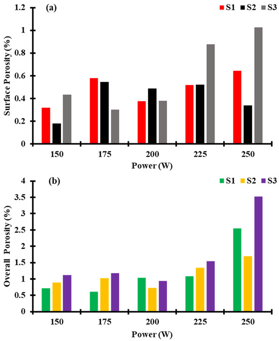 Results of the manufactured Fe-Mn-Al-Ni SMA’s average surface porosity (a) and overall porosity (b) measurements. S1, S2, and S3 stand for the corresponding scanning speeds of 800 mm/s, 1000 mm/s, and 1200 mm/s.