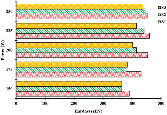 Hardness results of Fe-Mn-Al-Ni SMA samples fabricated at a power of 150–250 W with three different scanning speeds including 800 mm/s (S1), 1000 mm/s (S2), and 1200 mm/s (S3).