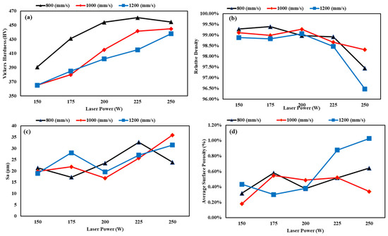 To get better visualization of the results, interaction plots for the effect of both laser power and scanning speed on the hardness, relative density, surface roughness, and average surface porosity area ratio were developed and are shown in Figure 9. From interaction plot (a), it can be concluded that a scanning speed of 800 mm/s improved the hardness significantly and showed the highest HV values between 200 W and 250 W, decreasing beyond 225 W. From interaction plot (b), it can be inferred that a scanning speed of 1200 mm/s yields the worst relative density, and the relative density beyond 200 W decreases noticeably. From interaction plot (c), despite the general trend of increasing surface roughness as laser power increases, at a laser power of 200 W, there are low values of Sa and low variation associated with different scanning speeds. From interaction plot (d), it can be observed that at 200 W, there is the lowest variation and relatively low values of the average surface porosity area ratio.