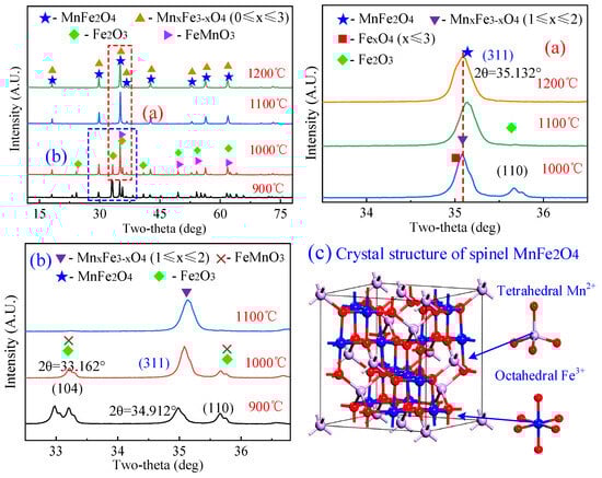 XRD patterns of the synthetic MnFe2O4 samples at a temperature from 900 to 1200 °C with the atomic ratio of MnO: Fe2O3 = 1:1 for 60 min in air atmosphere and the crystal structure of spinel MnFe2O4, (a) the oxidization roasting temperature of 900 °C to 1200 °C, (b) Partial enlargement of Figure with two-theta range from 33.5° to 36.5°, (c) Partial enlargement of Figure with two-theta range from 32.5° to 36.7°, (c) Crystal structure of spinel MnFe2O4.