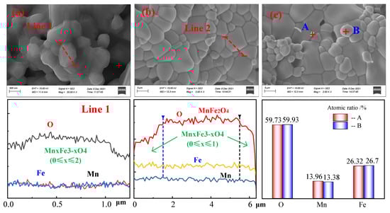 Figure 2 illustrates the scanning electron micrographs of the cross-sectional layers of the synthesized manganese ferrite samples at 900 °C and 1100 °C for 60 min. Figure 2a clearly shows that the synthesized ferromanganese oxides have a regular polyhedral structure at a roasting temperature of 900 °C. From the overall appearance morphology, it can be seen that the polyhedral particles have obvious accumulation and gaps of different sizes exist. However, the sample particles have obvious boundaries. The corresponding energy spectrum scan lines reveal that the Mn, Fe and O contents in the sample are basically constant at a ratio of 1:1:3, indicating a relatively uniform distribution of the products. This result precisely coincides with the characteristic XRD peak at 900 °C in Figure 1. The cross-sectional SEM images of the sample roasted at 1100 °C for 60 min are shown in Figure 2b,c. The particles in the sample exhibit a flat spherical shape, and the gaps between the particles are relatively uniform with obvious boundaries. The energy spectrum analysis revealed that the average contents of integrated Mn, Fe and O were 13.67%, 26.51% and 59.83%, respectively, which were close to the theoretical values of the atomic ratio of pure MnFe2O4. The Line 2 scan observed that the atomic ratios and contents of Mn, Fe and O were constant on individual particles, indicating that the distribution of these elements in the sample product was uniform. The experimental results do not correspond to the theoretical values due to the rapid oxidation rate of Mn2+, and the related reasons can be further determined comprehensively by magnetic analysis.