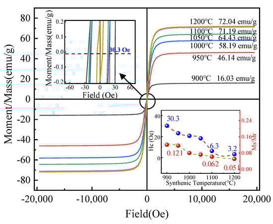 The magnetization hysteresis loops of the prepared MnxFe3−xO4 products at 900–1200 °C were investigated with VSM, as illustrated in Figure 3. The saturation magnetization intensity Ms of the samples at different temperatures increased from 16.03 emu/g to 72.04 emu/g with increasing roasting temperature. The saturation magnetization intensity was 16.03 emu/g at 900 °C. The explanation for this result combined with Figure 3 shows that a large amount of MnFeO3 could be generated from MnO and Fe2O3 at lower temperature, which leads to the decline of magnetism. Researchers have found that the saturation magnetization strength is proportional to the grain size of the magnetic material [24,32,33], and increasing the temperature will benefit the growth of MnxFe3−xO4 [18,24]. In addition, the saturation magnetic strength of MnFe2O4 involves the distribution of cations on the A or B sites of the spinel crystal structure sites. Therefore, the variation pattern of Ms of manganese ferrite as affected by temperature is also attributed to the variation in Mn2+ or Fe2+ (Fe3+) concentration in the MnxFe3−xO4 sample. The coercivity (Hc) and the ratio of saturation magnetization intensity (Ms) to residual magnetization intensity (Mr) at room temperature and oxidation roasting temperature are shown in Figure 3. The hysteresis lines of the roasted samples show a narrow hysteresis behavior of the ferromagnetic material. As the roasting temperature increased from 900 °C to 1200 °C, the coercivity of the samples decreased from 30.3 Oe to 3.2 Oe, and Ms/Mr decreased from 0.121 to 0.051. The saturation magnetization intensity of the pure MnFe2O4 sample at 1100 °C was 71.8 emu/g [34] and 71.19 emu/g in this study. The crystalline particles of the samples are more complete, and the magnetic properties are closer to those of the pure MnFe2O4 sample, which has better magnetic properties.
