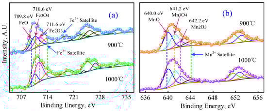 X-ray photoelectron spectroscopy (XPS) was used to detect and assess the chemical states of Fe and Mn to clarify the oxidization behavior and consolidation mechanism of manganese ferrite MnFe2O4. The XPS spectra in the Fe 2P regions and Mn 2P regions are illustrated in Figure 4a,b. XPS data are systematically analyzed and evaluated through XPS database XPS Peak software 4.2. In the preparation process of MnFe2O4, the valuable metal ions could occupy the tetra-coordination and octa-coordination in the spinel crystal structure, resulting in different valence states of Fe cations (Fe2+ and Fe3+) and Mn cations (Mn2+ and Mn3+) for different binding energies of the Fe 2p electrons and Mn 2p electrons. In addition, the binding energies of the Fe 2p3/2 peaks for FeO, Fe3O4 and Fe2O3 appeared at 709.8 eV, 710.6 eV and 711.6 eV, respectively. The binding energies of the Mn 2p3/2 peaks for MnO, Mn3O4 and Mn2O3 appeared at 640.0 eV, 641.2 eV and 642.2 eV, respectively [34,35]. It was found that the intergrade area of Fe2p3/2 for FeO at a binding energy of 709.8 eV gradually decreased and that of Fe3O4 at 710.6 eV also decreased, while that of Fe2O3 at 711.6 eV gradually increased with increasing oxidization roasting temperature from 900 °C to 1000 °C. In the meantime, the intergrade area of Mn2p3/2 for MnO at a binding energy of 709.8 eV and Mn3O4 at a binding energy of 641.2 eV changed slightly, and that of Mn2O3 at a binding energy of 642.2 eV instantly decreased. These results showed that the higher temperature could effectively enhance the oxidation of Fe2+ ions in composite oxides to Fe3+ ions and improve the dissociation of Mn2O3 in the crystal spinel structure of MnFe2O4.